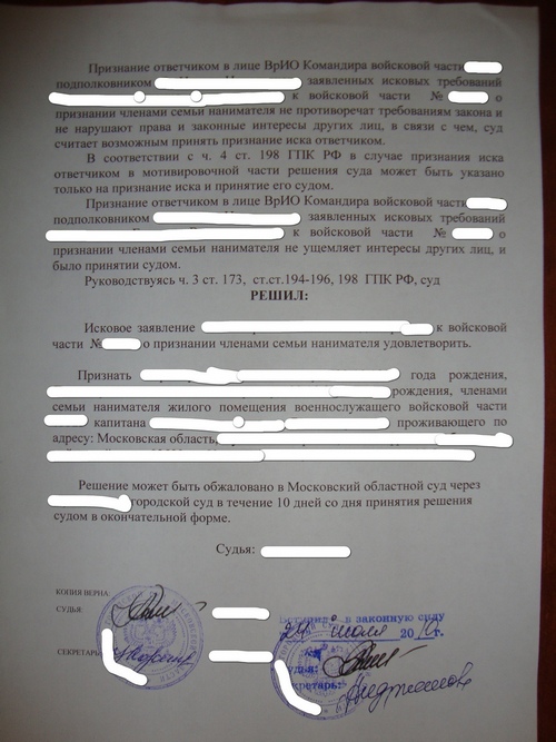 Здравствуйте, братцы!!! Подскажите, пожалуйста, где можно взять примерные Решения суда о признании членами семьи военнослужащего внуков, имеющего жильё в собственности. Получил извещение на недостающие квадраты (квартиру по договору социального найма с доплатой на излишки), собрал документы в РУЖО, подал в суд о признании внуков членами моей семьи, имеем в собственности жилье. Живем все вместе(я, супруга, одна дочь с супругом и моим внуком, другая дочь с другим моим внуком), ведем совместное хозяйство. Советуют иметь на суде уже примерные решения суда по данному вопросу. Ранее таких вопросов в нашем районном суде не было. Заранее благодарю.