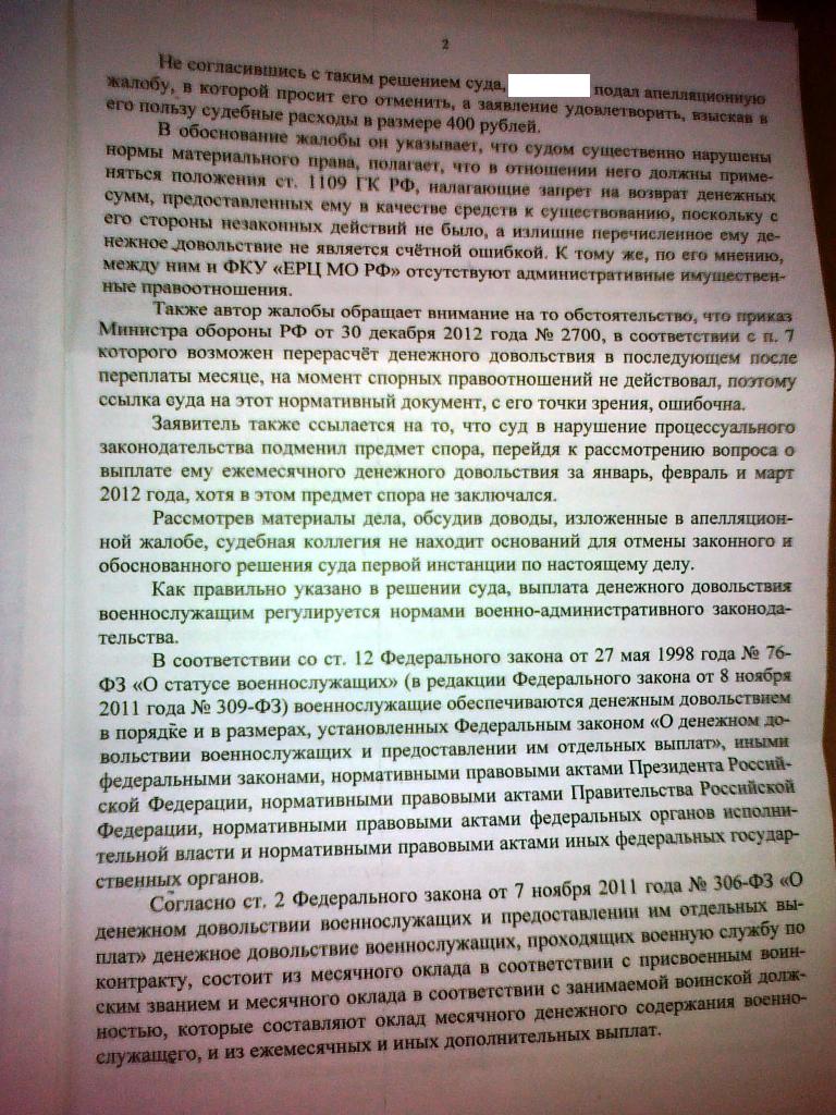 это при том,что по хорошему в феврале я должен быть был уволен,так как получил квартиру,соответственно об авансе речь вообще не могла идти. Но судя по данному определению ИМХО 1109 к нам применима,просто по мнению суда не было у меня никакого обогащения,и ещё интересно то,что суд первой инстанции применил положения не действующего приказа 2700 пункта 7,а окружной сказал что всё в порядке,так как аналогичная норма была в приказе 200