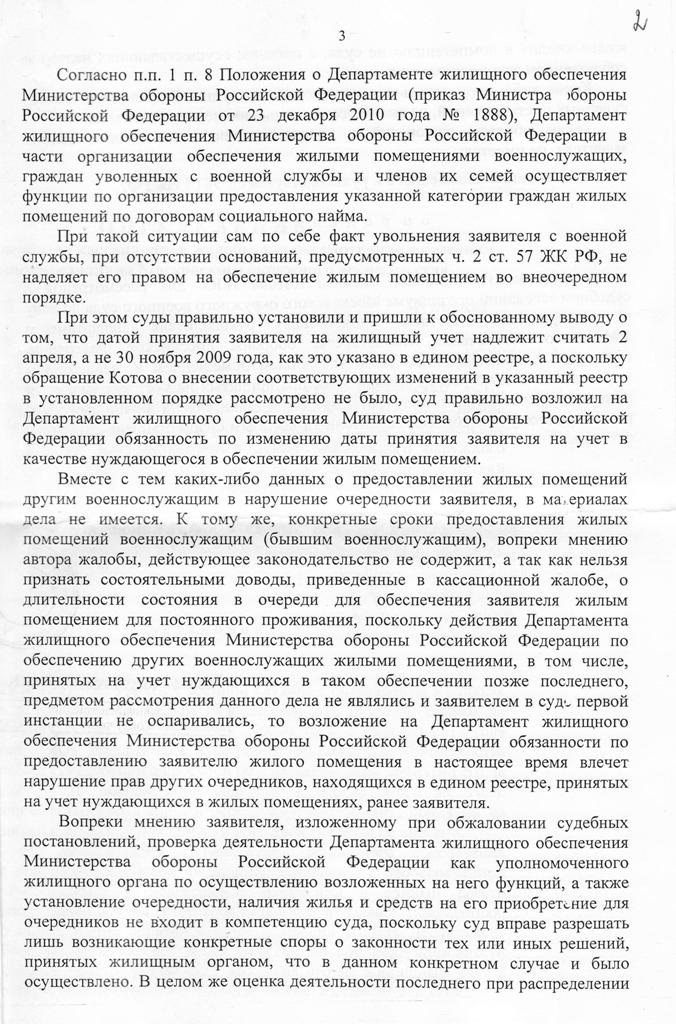 #2666Я думаю, что Верховному суду будет интересно покопаться и узнать Вашу личную карточку очередника под № ???????????????. Кстати, такие личные карточки ведутся в ФГКУ РУЖО МО РФ. Почему они не ведутся в ДЖО МО РФ - это вопрос? Я судился с ДЖО по распределенному жилью без допов в МГВС и результат,тот же -ОТКАЗАТЬ. Хотя знаю и владею информацией, что есть свежие решения не Московских военных судов - УДОВЛЕТВОРИТЬ или ЧАСТИЧНО УДОВЛЕТВОРИТЬ. Готовлюсь подать аппеляционную жалобу в МОВС, где буду делать ссылку на положительные решения. Если и это не поможет, тогда в Верховный суд.Подобный случай, что и в № 2661
