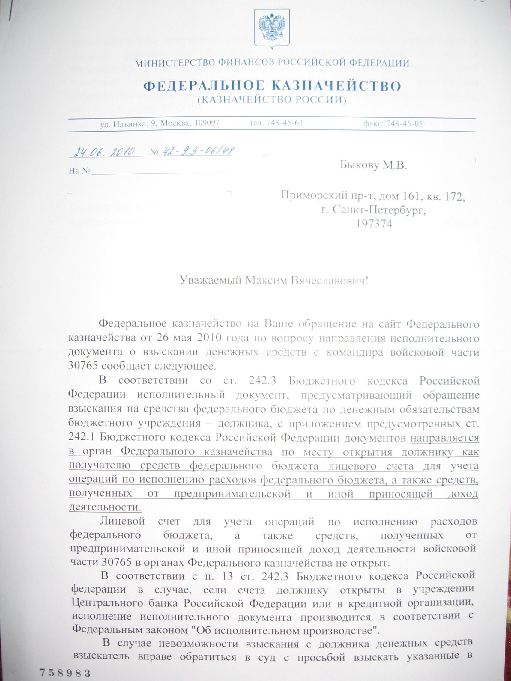В продолжение сообщения № 277 выкладываю файлы - ответ из Федерального Казначейства, по вопросу исполнения решения суда, если ответчик находится за границей.
