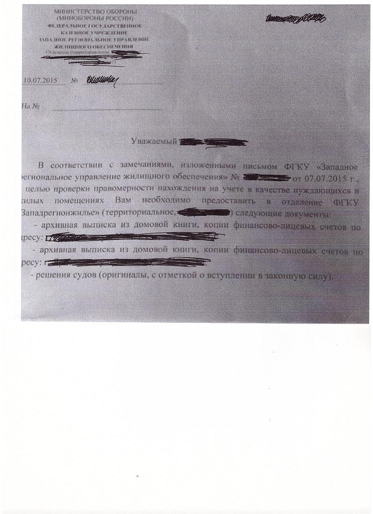 ДЖО пришли в суд и принесли письмо, где просят предоставить архивные справки и копии счетов с целью проверки правомерности нахождения меня и моей семьи на учете. Такое письмо им спустили сверху (РУЖО)
