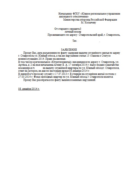 В 17 октября 2014 года командир войсковой части ходатайствовал перед начальником Ставропольского отделения ЮРУЖО о распределении мне квартиры. Ответ на которое получен не был.