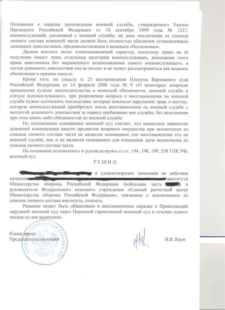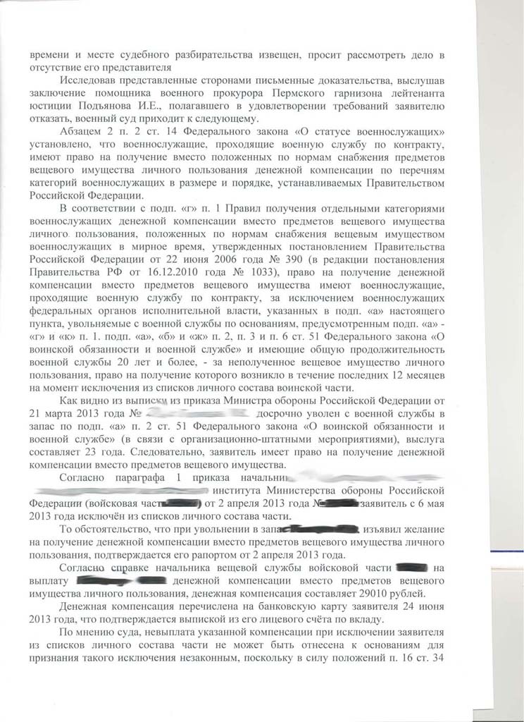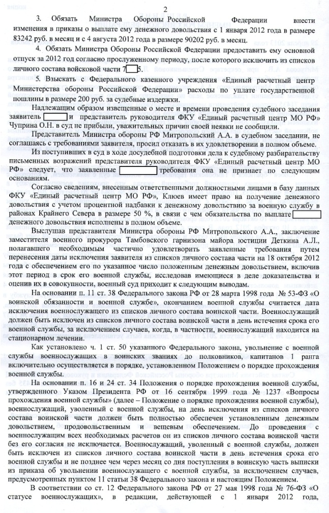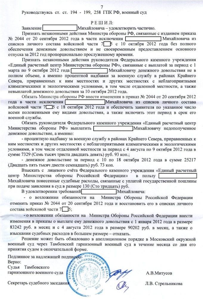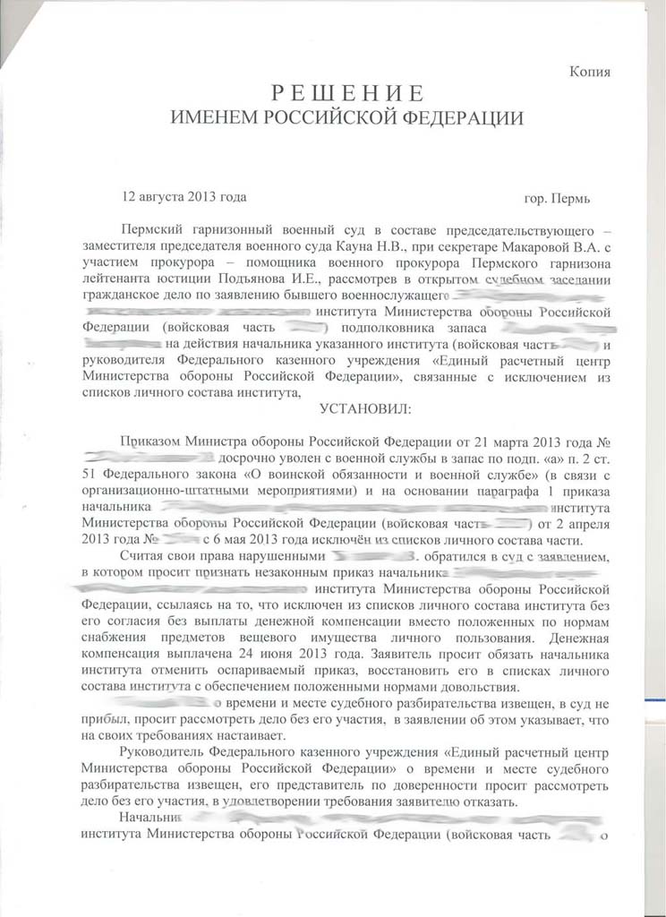 Ситуация такая. Капитан, жильем обеспечен, Уссурийск. В марте этого года пришла выписка из приказа МО об исключении из списков части. Как обычно - задним числом, без предоставления основного отпуска за 2013 год. Подал в суд, суд выиграл 22 мая. Решение получил 28 мая. Вчера, 18.07 получил заказное письмо с суда, что решение суда вступило в законную силу с 1 июля и всем адресатам (МО, ЕРЦ) отписаться в течении месяца о выполнении решения в суд т.к. "дело находится на контроле". Одновременно пришло еще одно письмо с суда с вложенным исполнительным листом. Вроде бы все ок :)