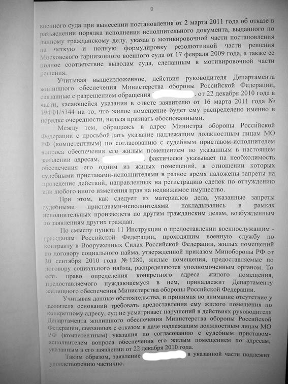 Ввопрос к знающим, спрашивал в другой ветке, отправили сюда. Нахожусь в распоряжении командира части с 1.01.2005г. Жильём до сих пор не обеспечен. У меня на руках есть решение Московского гарнизонного военного суда о немедленном обеспечении меня жильём и последующем увольнении. Правда это решение аж от февраля 2006 г. и суд обязал исполнить это решение командира части, всех других вышестоящих начальников, которых я указал как ответчиков суд отмёл. В свете проведённых реформ (упразднении жил. комиссий, КЭЧ, появление пр.1280 и т.д.) обязывает ли это решение к чему нибудь ДЖО, является ли ДЖО правоприемником института жил. комиссий и связанных с ним должностных лиц. Суд не усомнился в моём праве на жильё и, следовательно, мне больше не нужно ничего доказывать ДЖО, в смысле сбора всей этой кучи справок. Или я не прав? Если уже было, не пинайте, а скажите где посмотреть.