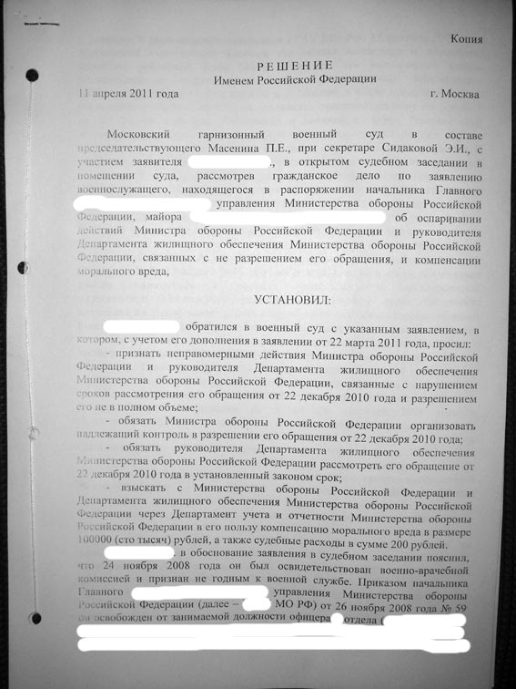 На основании решения 101 гарнизонного военного суда от 16 июля 2010 года я старший прапорщик Кузнецов Валентин Олегович и члены моей семьи признаны нуждающимися в улучшении жилищных условий по избранному месту жительства в г. Санкт-Петербург.