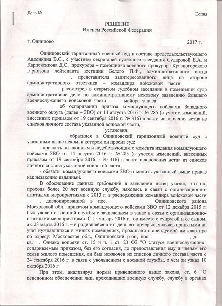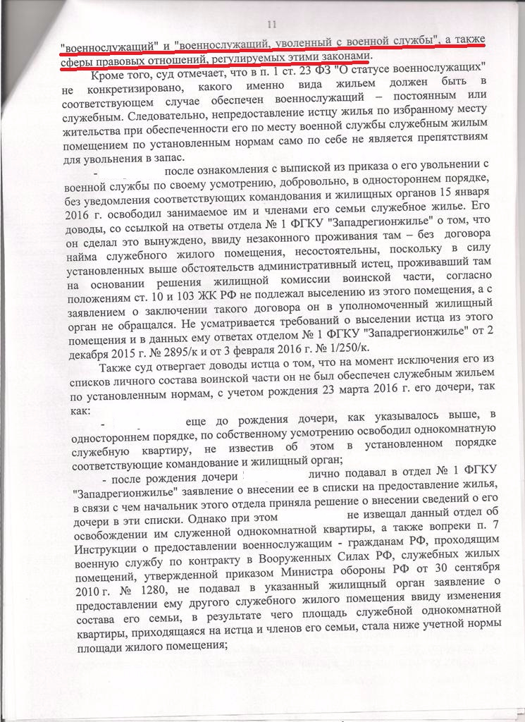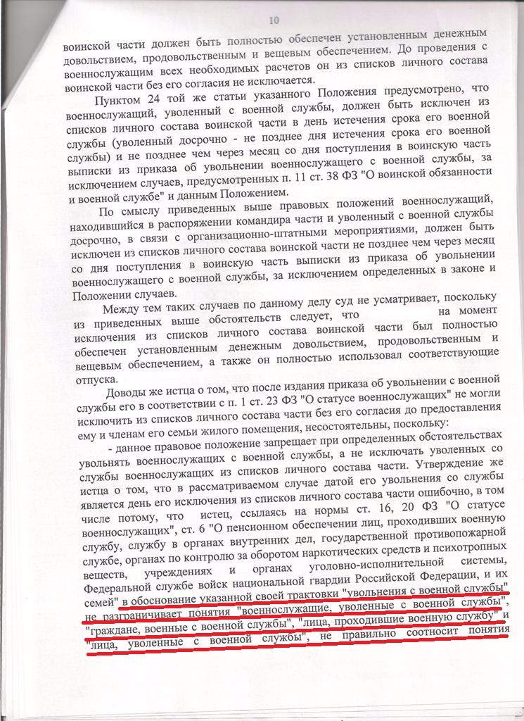 #812Никто не мешает.... В судах общей юрисдикции оспаривали. Перед проведением беседы просили командование нас военной службы не увольнять, письменно обращались с рапортами заключить контракт сверх предельного возраста, дать возможность проходить военную службу до момента обеспечения жильем по избранному месту жительства....должностные лица такой возможности не дали. Обжаловали в суд! Суды везде применяли две нормы права: пункт 17 статьи 34 Положения и пункт 14 статьи 15 с формулировкой: " для военнослужащих желающих получить жилое помещение не по месту службы пунктом 14 статьи 15 закона установлен иной порядок обеспечения их жильем, направленный на реализацию их права на свободу передвижения, при котором они не имеют права проходить военную службу до обеспечения их жильем, то есть не имеют права на гарантию, установленную абзацем вторым пункта 1 статьи 23 закона".... Пройдены все инстанции от гарнизонного суда до заместителя председателя ВС... Поэтому и готовим жалобу в КСкто мешает обжаловать в судебных инстанция СОЮ и обратиться в конституционный суд?QR_BBPOST Так мы хотели служить по контракту до того момента пока нам не дадут жилье для постоянного проживания...а нас взяли и уволили со ссылкой на пункт 14 статьи 15