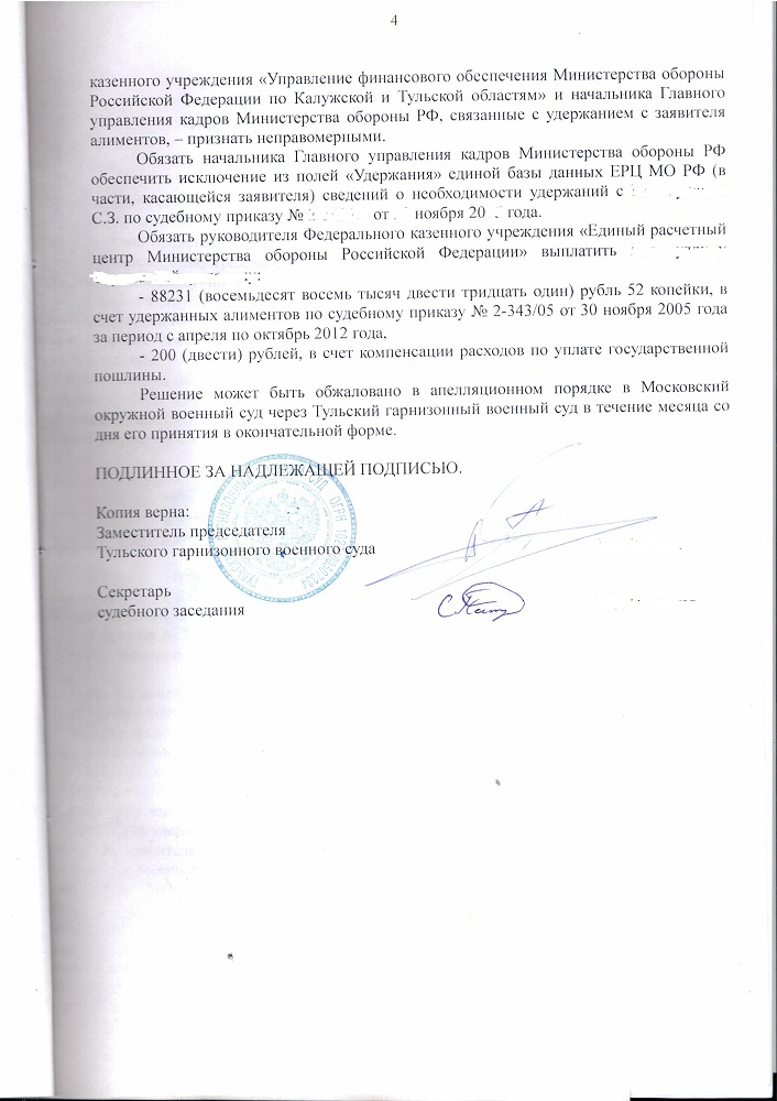 Тут надо смотреть суть самого дела - может ЕРЦ по инерции отнимало алименты, не имея от ФССП необходимых документов или удержание алиментов уже не предусматривается ввиду урегулирования процесса в другом порядке, например добровольное соглашение или как то по другому....Суть дела, с военнослужащего незаконно удерживали алименты. деньги за несколько удержанных месяцев вернули. и обязали в дальнейшем не удерживать