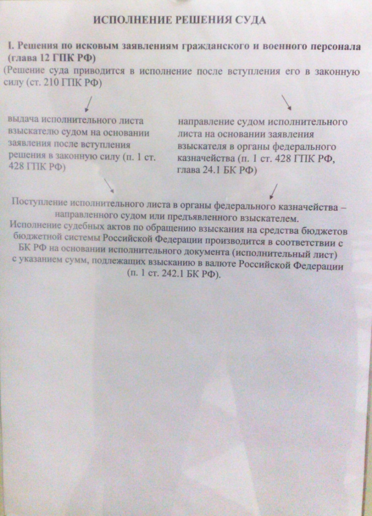 Здравствуйте. Подавали в суд на командира части ЕРЦ и министра обороны по поводу нарушения порядка увольнения,внесении изменения в приказ МО, выплате денежного довольтвия по новую дату исключения из списков личного состава...определение было вынесено 16 апреля, сегодня 17 мая и как я понимаю срок выплаты денег истек. Кто нибудь сталкивался с таким? Куда идти с исполнительным листом, если мы живем в Архангельске а ЕРЦ в Москве?