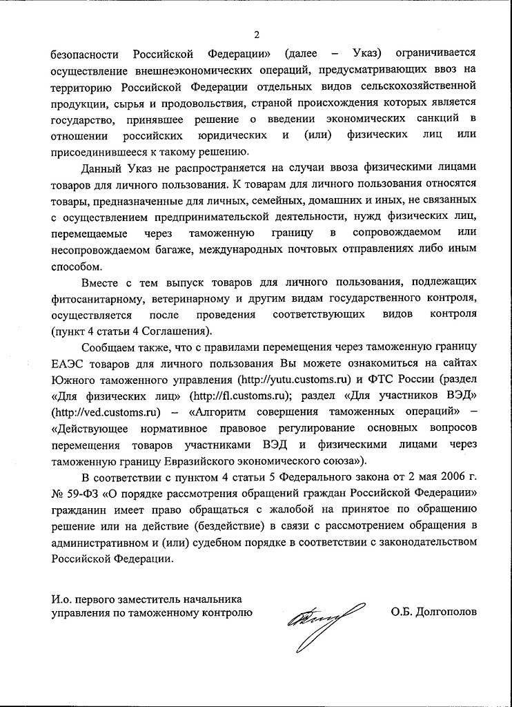 #524По моему обращению дан ответ: Указ Президента РФ о санкциях распространяется исключительно на внешнеэкономическую деятельность и не касается товаров, приобретаемых для личных нужд.QR_BBPOST Ульяновский суд запретил россиянам смотреть на испанский хамон
