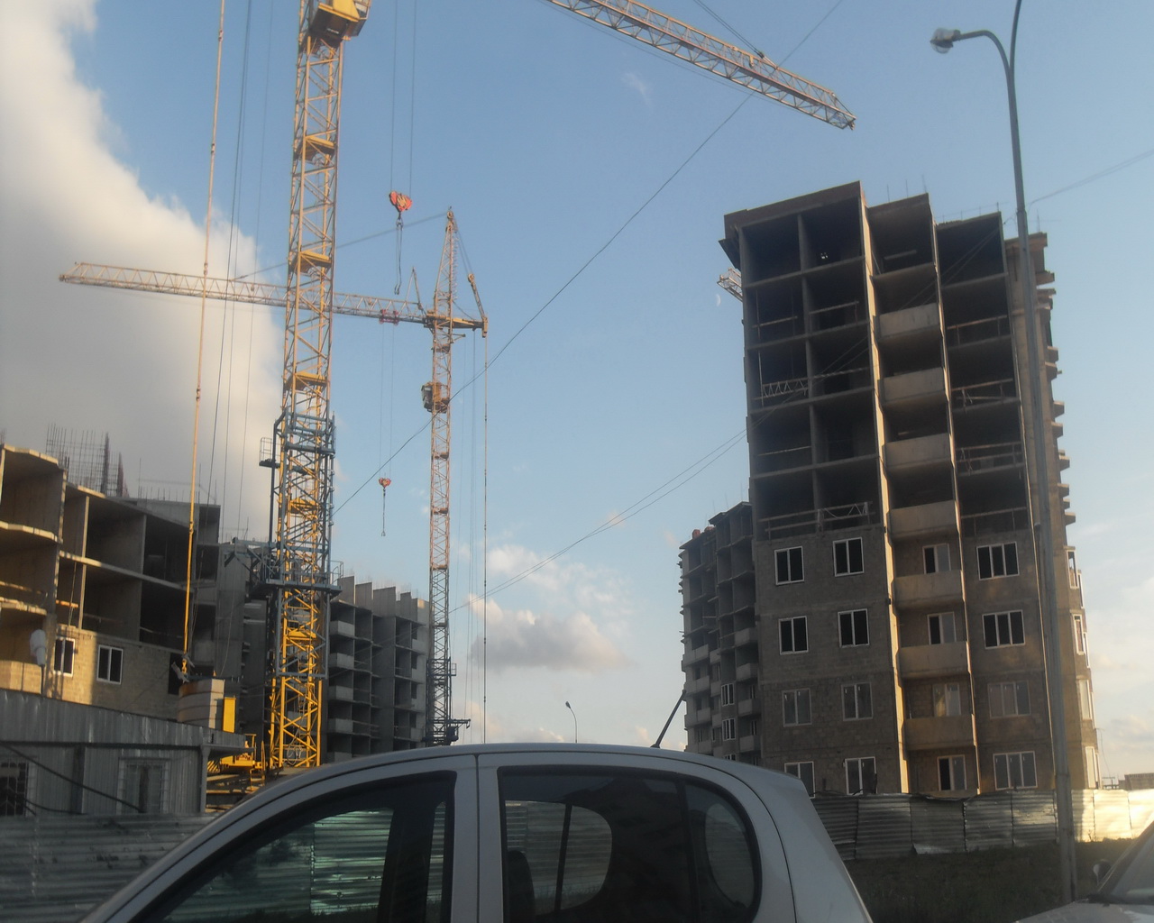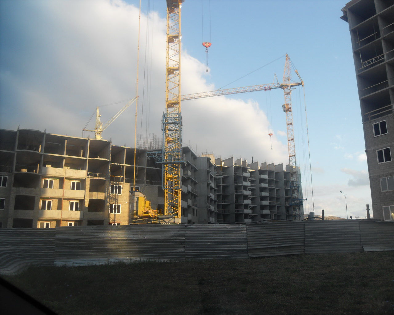 На первом корпусе от моря, работы в основном велись на крыше и работали два крана, внутри дома делали межкомнатные перегородки, я так понял где-то до 4-го этажа, окна вставлены до 5-го этажа включительно, но не везде, + электрики проводку тянули. Как-то все одновременно делается, хотя на дальней секции от моря внешняя стена еще не готова. Во-втором корпусе окна вставлены до 2-го этажа, работы велись только в ближней к морю секции. Ну, а на 3 (1) корпусе, все как было, так и осталось.
