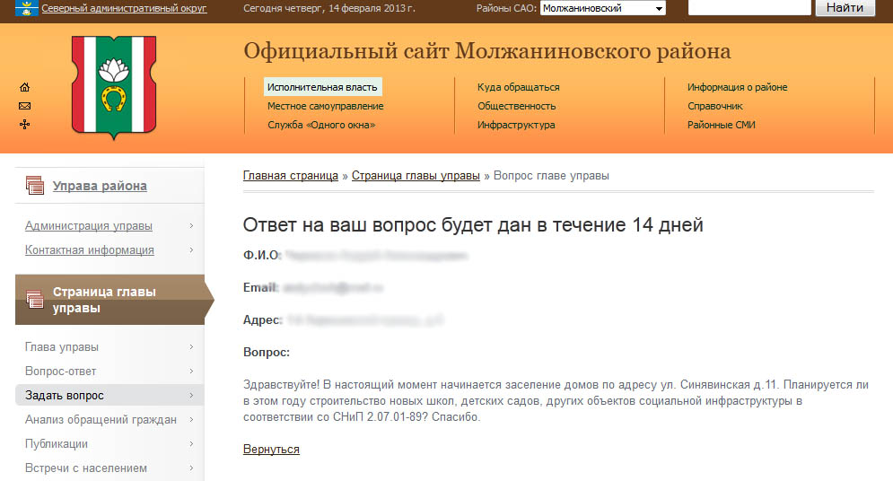 это тоже меня смущает... но можно начать издалека типа: Идет застройка по адресу синявинская вл.11. Из данных СМИ и ДЖО данные дома планируются к заселению семей военнослужащих. Прошу разъяснить сроки строительства и вводу в эксплуатацию, а также номинальное количество следующих объектов инфраструкту (в соответствии со СНиП .....): школа, детский садик, поликлинника детская, поликлинника взрослая..... в случае, если данные объекты не планируется вводить в эккплуатацию до 1 сентября 2013 года (ориентировочный срок "готовности" микрорайона) прошу разъяснить, к каким учреждениям г.Москвы будут прикреплены жители района, учитывая, что близлежащие садики, школы, поликлинники и проч относятся к инфраструктуре области и не могут эксплуатироваться в интересах жителей г. Москвы.