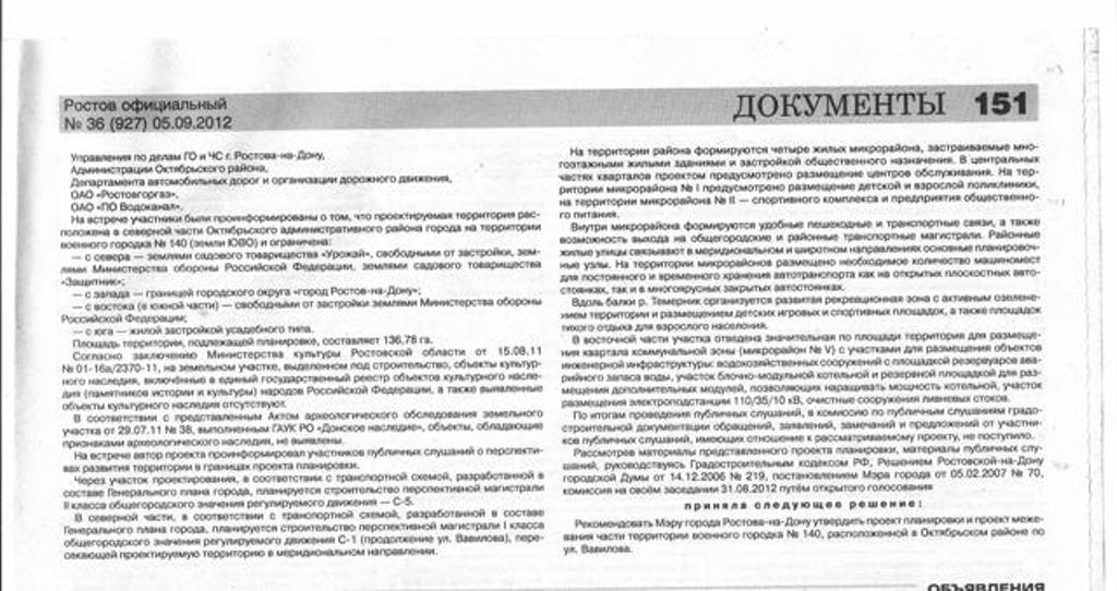 #1833Здравствуйте, ув. Таранка. Пытался найти сей документ, скачать с оф. сайта, не получилось. Пожалуйста, если у Вас есть газета, отсканируйте или сфотографируйте с большим разрешением. То, что выложено на форуме, нечитабельно. И всё равно, огромное Вам спасибо!!!Заключение о результатах публичных слушаний по проекту планировки и проекту межевания части территории военного городка № 140, расположенной в Октябрьском районе по ул. Вавилова,