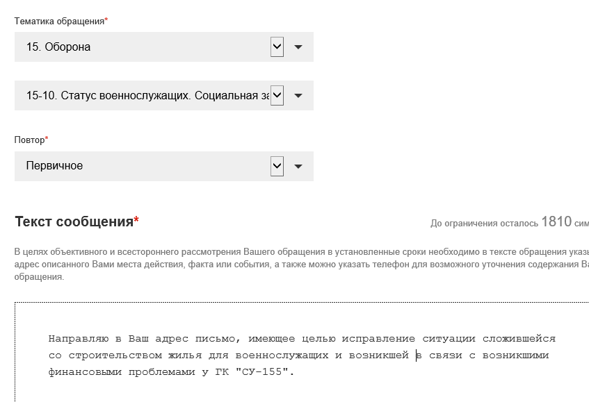 При отправке необходимо выбрать тематику сообщения, вот таким образом...