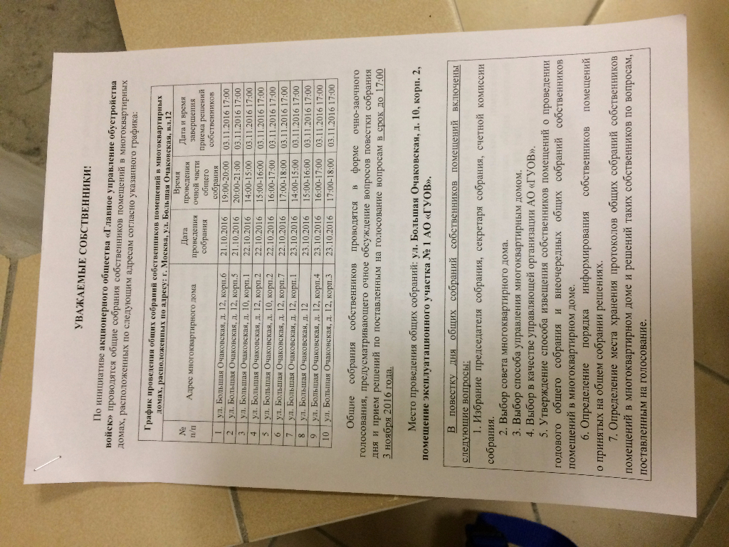 #26512киля, кто-нибудь спросил или потребовал у Максима копию или оригинал приказа гендира ГУОВ, на основании которого эти ребята топчутся по нашей территории, проводят собрания, производят расчет сумм для оплаты нами ЖКУ? Ведь наверняка был приказ, где расписано, что делать, нарезаны районы или участки эксплуатации, расписаны должностные лица, определены задачи, наверняка одна из них это взаимодействие с жильцами. Я на стендах ГУОВ не вижу ни этого приказа, ни лицензии на право управления МКД, ни договора пресловутого 4-ЖоФэ. Люди просто пришли и чего-то делают, а на основании чего? Почему мы им должны на слово верить, тем более деньги платить?