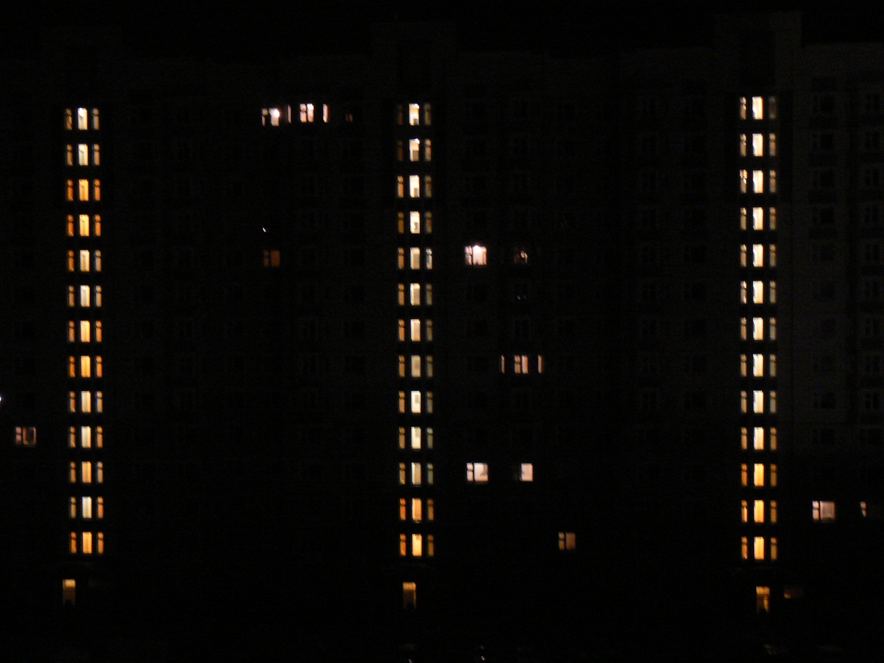 Полагаю, что это вечернее (не ночное) фото дает реальное представление о проценте фактически въехавших жильцов во многие дома. Конечно, заселенность (не распределенность) других домов может составлять и до 35-40 %. НО НЕ БОЛЕЕ ТОГО.