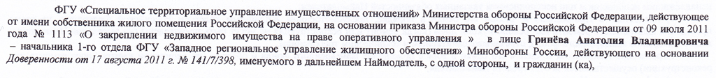 А ДСН: ФГУ "Специальное центральное управление имущественных отношений" МО РФ , действующее от имени собственника жилого помещения РФ , на основании приказа МО РФ от ____. № __ "О закреплении недвижимого имущества на праве оперативного управления за ФГУ "СТУИО" МО РФ