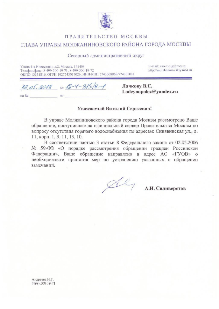 С 06 мая 2018 года по адресу: г.Москва, ул. Синявинская, дом 11, корпус 1, 3, 11, 13, 10 (подъезды 5, 6) нет горячего водоснабжения.