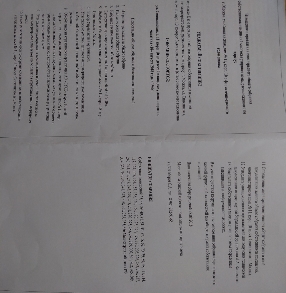 #33543Может я недопонимаю? В Решении п.6 сказано про Жилищник. Что-то не так? Выкладываю для понимания общей картины извещение и решение. Собрания жильцов пройдут по корпусам с 13 по 21 августа.QR_BBPOST ошибка данной повестки в том, что должен быть указан вопрос по заключению договора новой УК, с ее названием. Нельзя прекращать работу со старой УК без перехода на новую.