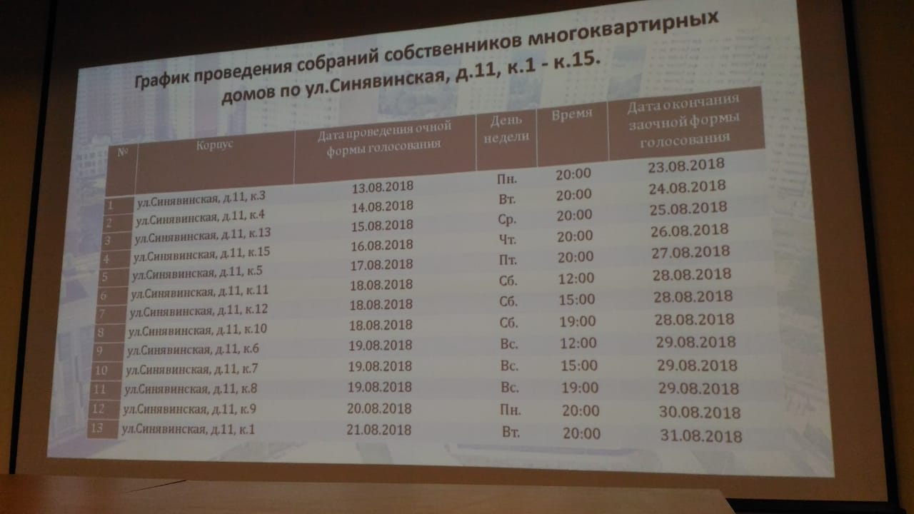 Уважаемый Константин, во первых в соцсетях:ОК, вк, фейсбук, Инстаграм непосредственно Артур выкладывает первично подобные новости. Далее, в чатах домов, админы также выкладывают эти анонсы! Скорее всего , вы не состоите в чате своего корпуса, как минимум, если вы в него хотите попасть, укажите в личку номер телефона и квартиры, и с вами свяжется админ вашего корпуса(передадим инфо). У каждого корпуса своя повестка собрания, по логике вам ее должны кинуть в почтовый ящик не менее чем за 10 дней до начала собрания! Проверяйте почту. Начало собраний 13.08,наш корпус первый в списке.[ref]Yulia Zhuk[/ref], сам глава управы Молж-го района будет на этом обходе? Откуда Вы получаете инф-ию об обходах? Следующие вопросы не к Вам.