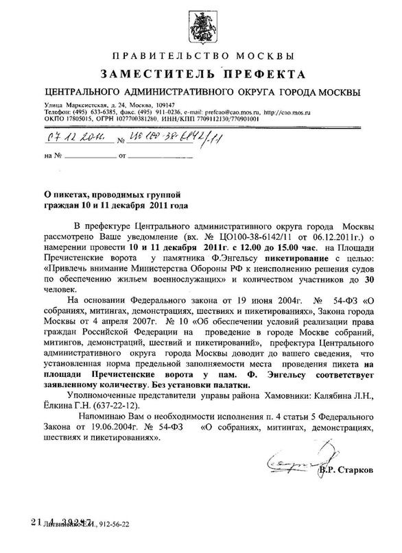 В СУББОТУ И ВОСКРЕСЕНИЕ 10 И 11 ДЕКАБРЯ 2011 ГОДА С 12-00 ДО 15-00 БУДУТ ПРОХОДИТЬ ПИКЕТЫ БЕСКВАРТИРНЫХ ВОЕННОСЛУЖАЩИХ, ОБМАНУТЫХ МИНИСТЕРСТВОМ ОБОРОНЫ РФ!