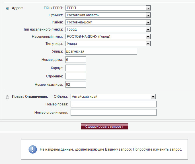 Таранка, извините пжлста, но не дружит со мной росреестр. Набираю поиск по адресу: г. Ростов-на-Дону, ул. Драгунская, 6, кв. 92 и ..."Не найдены данные, удовлетворяющие Вашему запросу. Попробуйте изменить запрос."