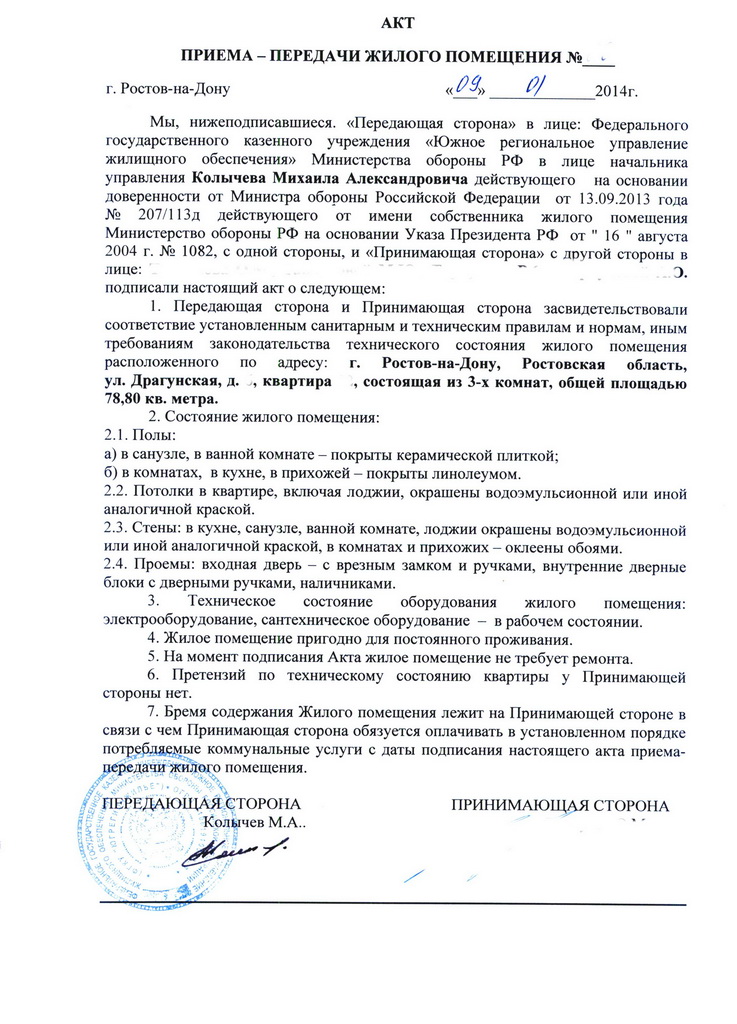 Акт приема-передачи жилого помещения от … месяца … года, подписывается между военнослужащим и начальником ФГКУ «Западное (Южное, Центральное, Восточное) регионального управления жилищного обеспечения» Министерства обороны Российской Федерации, и получается вместе со всем комплектом документов для оформления права собственности. А акт приема квартиры Вы будете подписывать на месте - это совсем другой документ, по которому в случае наличия недостатков в квартире Вам их должны устранить.Совершенно верно! А оформит тот первым кто первым оформит акт приёмо-передачи жилого помещения т.е. вашей будущей квартиры, а для этого нужно ехать полюбому. А без акта приёмо-передачи вам не оформят собственность соответственно у офомившего ДП преимущества по любому.