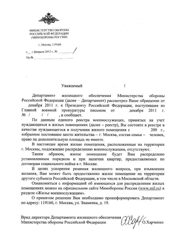 Вы быстрей получите жилье в Москве. Читал где то, вроде в этом году должны вопрос закрыть.И,видимо, продолжает служить? Тогда у Вас хорошие перспективы. Мне же приходится иметь дело с ДЖПиЖФ г. Москвы с 2001 г. , как уволенному в запас. И только в этом году пошла "движуха",