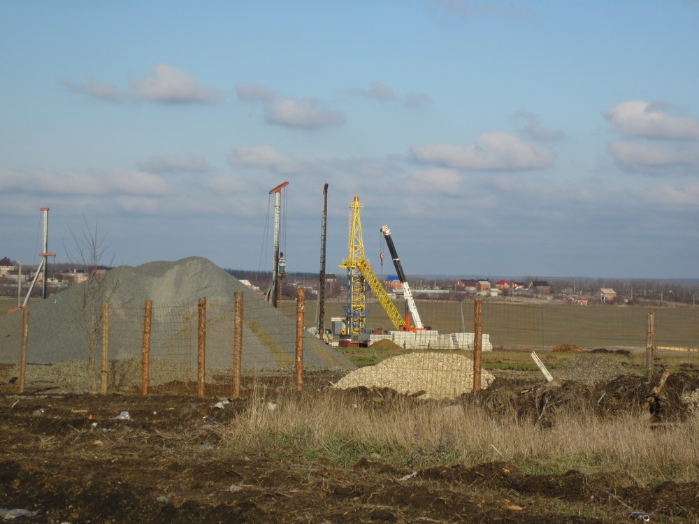 О стройке. Роют шестой котлован. В трех забивают сваи. В первых двух этот этап работы движется к завершению. Кол-во свай, забиваемых для одного дома впечатляет, где-то порядка 750! Вот почему так долго.Да о сваях, раньше говорили,что с Краснодарского края, а сейчас по слухам ОБС, вроде договорились в Ростове. Уже установили первый кран. Блоки складируют внизу.С дороги видно, стоят в два ряда.
