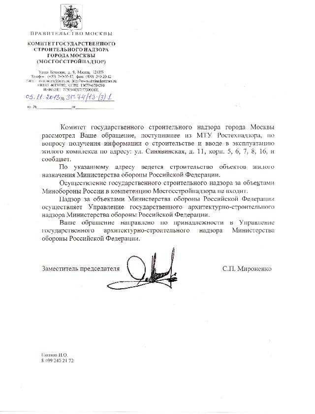 По вопросу контроля строительства и ввода в эксплуатацию, а также передачи домов на Синявинской в собственность Москвы