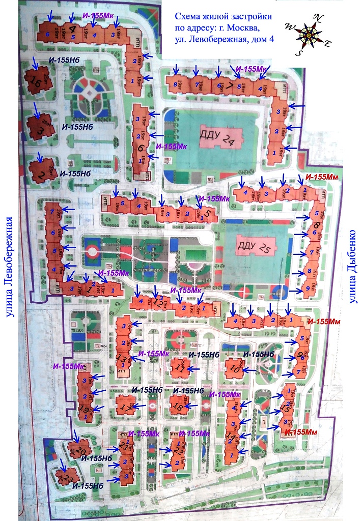 Схема с нумерацией подъездов. Стрелками указаны входы в подъезды.Как активный участник подскажите - подъезды 19 корпуса "смотрят" на дом 4А (девятиэтажку) или на башни?