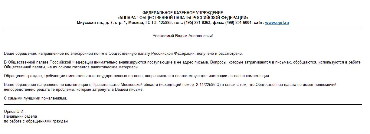– электронное письмо в мой адрес (имеется на форуме) в виде текста -«Ваше обращение, поступившее в Гос. Думу Федерального Собрания РФ, рассмотрено и направлено 14.12.2012 за № 2.8-15-36743 в Правительство Московской области…», подписано - консультант Т.П.Корж.