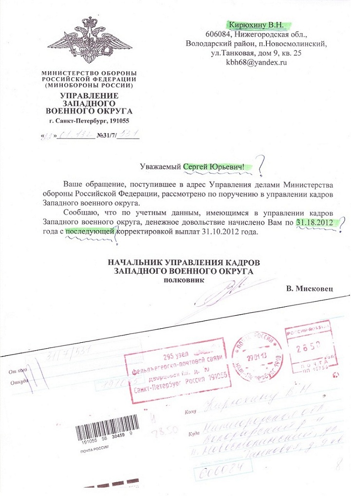 Получил сегодня официальное ЗАКАЗНОЕ письмо, подписанное НАЧАЛЬНИКОМ УПРАВЛЕНИЯ КАДРОВ многострадального ЗАПАДНОГО ВОЕННОГО ОКРУГА настоящим полковником В.МИСКОВЦОМ.