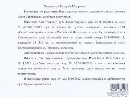 Сейчас судьба «дачи Сердюкова» решается в Арбитражном суде Краснодарского края. По бумагам на территории находится санаторий военного ведомства, на самом же деле «СитиИнжиниринг» фактически возвел здесь элитный поселок, где отдыхала, в частности, экс-чиновница Минобороны Евгения Васильева, а также другие высокопоставленные чины ведомства.
