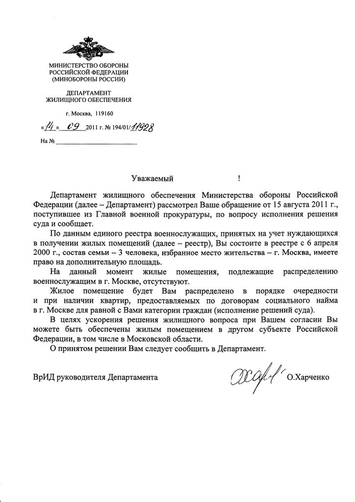 #3041По разъяснениям представителей МО (огмо) - в ДЖО писать не надо, только в 2 адреса (если служите не в Москве)Вы пишите одно и тоже только сразу в 3 адреса:Добрый день. Коллеги подскажите пожалуйста официальный почтовый адрес ДЖО. Хочу написать им рапорт о согласии оплатить превышение нормы жилплощади в случае ее получения. Если кто писал туда обращения, на чье имя их адресовать? И в течение какого срока должны дать ответ?
