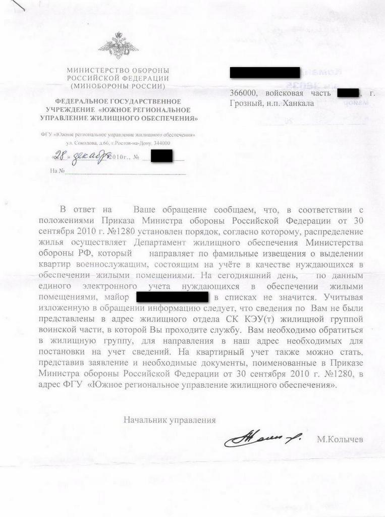Посмотрите ещё каких документов в соответствии с 1280 не хвает в Вашем деле. И обязательно получите подтверждение что Вас включили. Хоть и говорят, что скоро появится интерактивная очередь... Только когда это будет...Учётное дело я нашёл. Оно там же, где и было - в Ханкалинской КЭЧ. Я так понимаю, что особой проблемы нет? Нужно просто добиться, чтобы мои данные были переданы в РУЖО