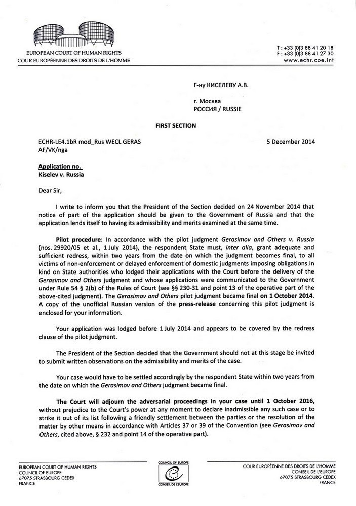 Мне пришло Вот это, пока разбираюсь.Кому еще такое пришло, отпишитесь. Я не понял, они дали два года Российским властям исполнить решения национальных судов, если те решение исполнят, тогда в ЕСПЧ рассматривать не будут?