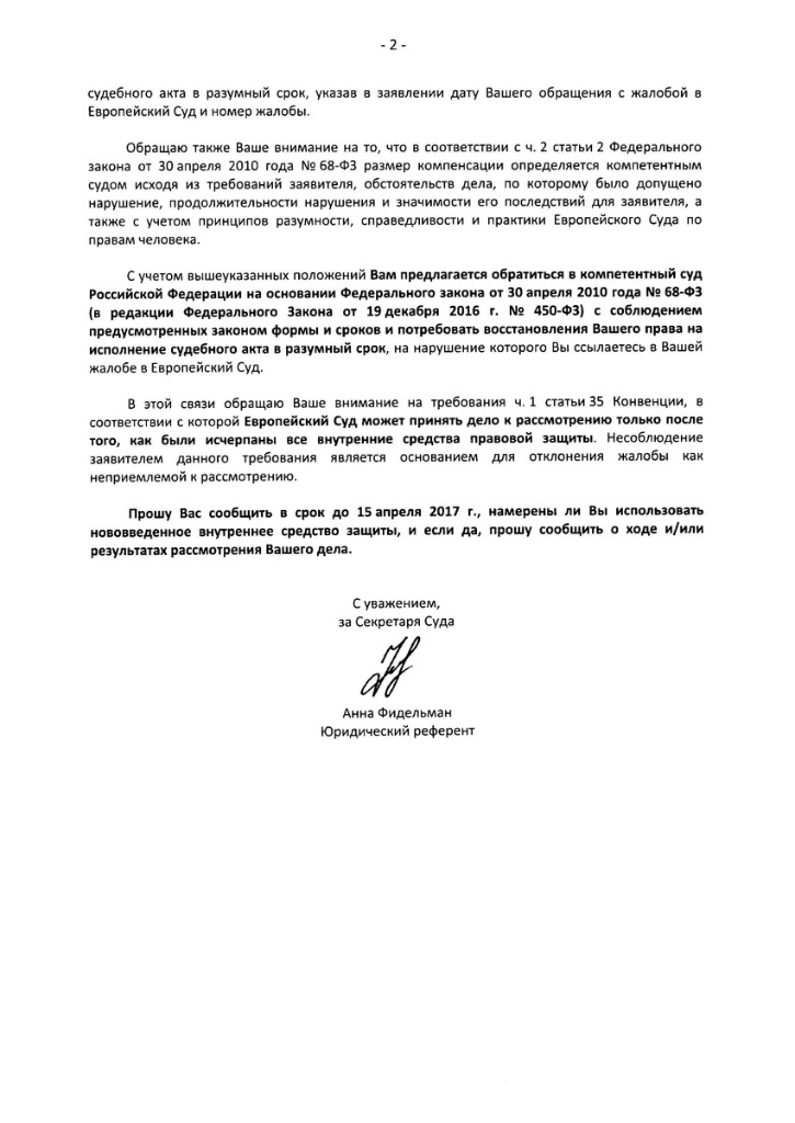 Да забыл сообщить, в свое время еще в 2010 году я обращался в российский суд с заявлением о присуждении компенсации за нарушение права на судопроизводство в разумный срок и права на исполнение решения в разумный срок.Получил отказ, по какой причине уже не помню, ответ не сохранился, который и направил в ЕСПЧ. Видимо в связи с этим мадемуазель - Фидельман не присылает мне письма как Вам :lol:
