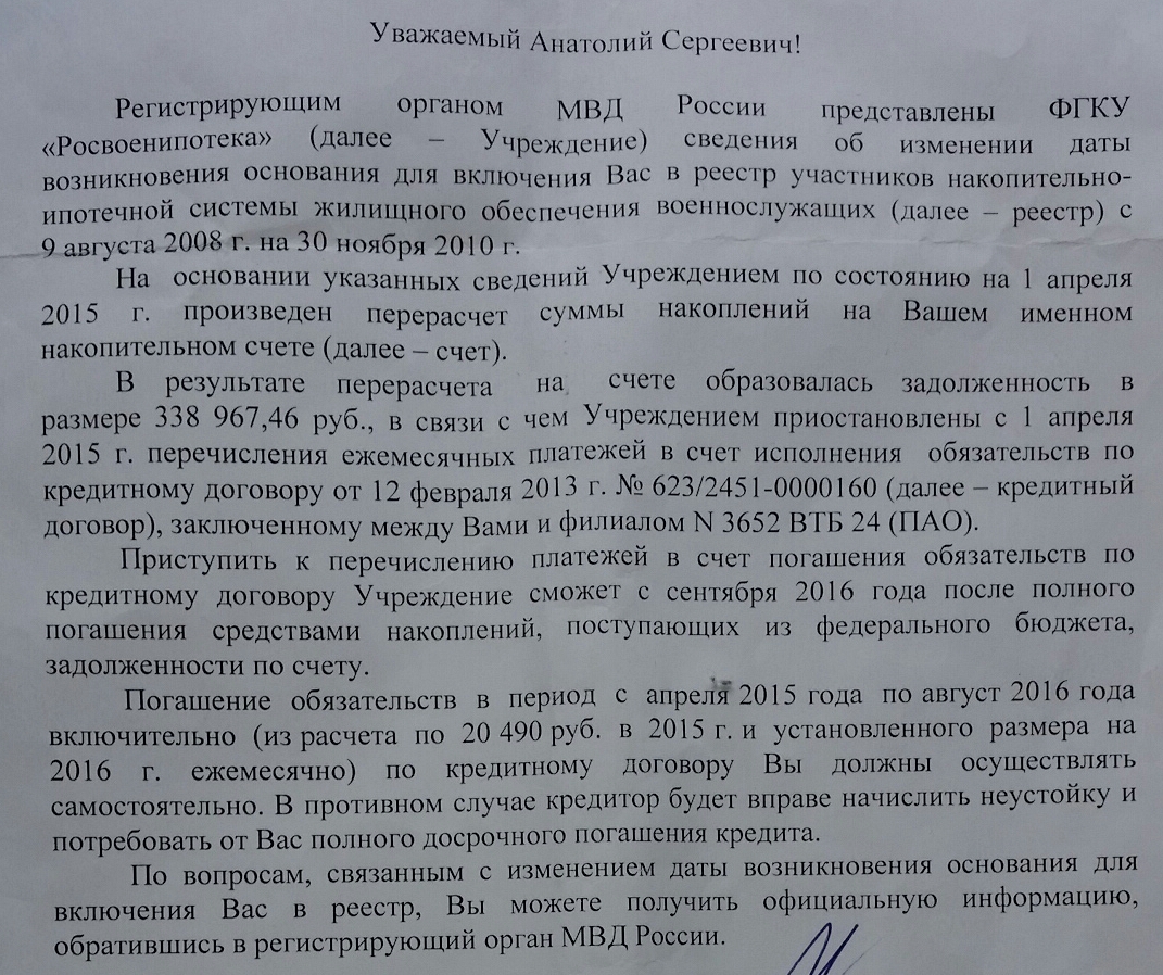 Здравствуйте,может есть у кого практика по моему вопросу,может кто поможет советом.Вообщем история такая,я подписал первый контракт в 2005 году,в 2007 году меня ставят на прапорскую должность и я перезаключил контракт на 5 лет.В 2008 году меня ставят на ипотеку автоматически по 3-ей категории,хотя я был еще не прапорщиком .Прапорщика мне присвоили в 2010 году.Я в 2013 году купил квартиру по военной ипотеке.Дней пять назад пришло письмо от военной ипотеки,с тем что у меня задолженность на моем ипотечном счету в размере 340 тыс,и то что я должен сам платить за ипотеку с апреля 2015 года,по ноябрь 2016 года.А те деньги которые шли на погашение ипотеки от министерства пойдут на погашения моего долга,потому что меня не правильно поставили на военную ипотеку.Должны были поставить в 2010 году,или я должен был написать в 2007 году рапорт.Как меня поставили на ипотеку и каким образом я вообще не понимаю.Есть ли у кого практика кто судился по такому вопросу,и в какой суд нужно обращаться?И есть ли шанс что я выиграю его,ведь моей вины там вообще нет,и на кого подавать в суд?Я ходил в службу КЕС в своей части,и спросил как мне теперь быть,сказали судиться с ними.