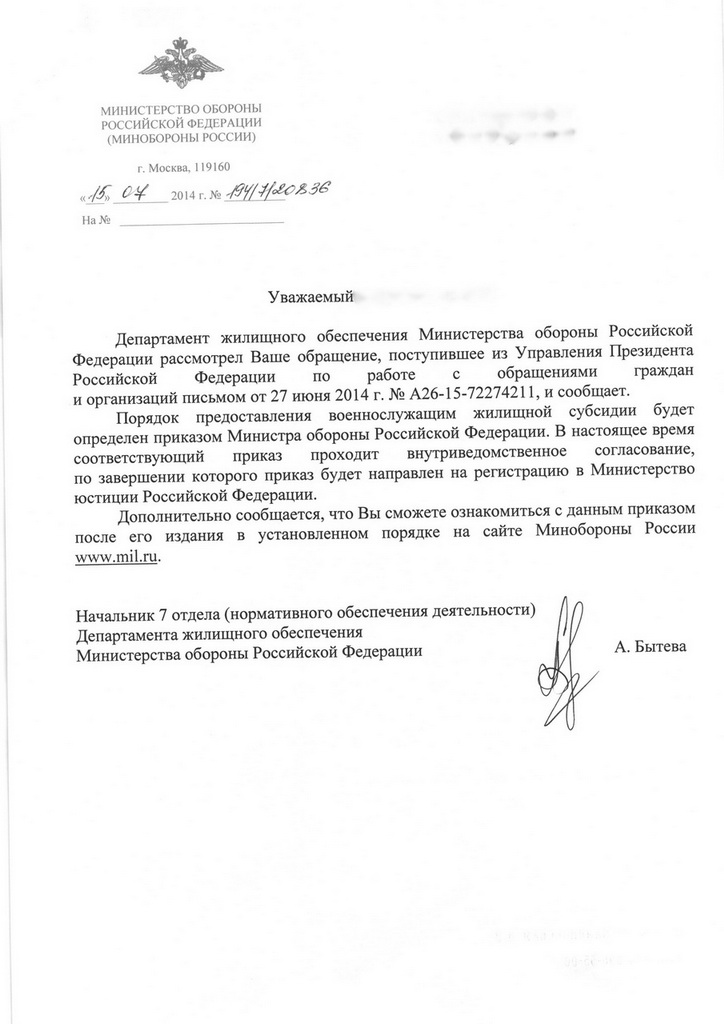 написал письмо на сайте http://letters.kremlin.ru/. Смысл: пояснить слова "Выделяются специальные жилищные субсидии". Указал, что Федеральный закон Российской Федерации от 28 декабря 2013 г. N 405-ФЗ "О внесении изменений в Федеральный закон "О статусе военнослужащих", вступивший в силу с 1 января 2014 года не выполняется в полном объеме, нет долгожданного приказа МО. Просил повлиять на МО в ускорении процесса выдачи ЖС. Также просил не передавать мое письмо в Министерство обороны, а спросить с МО за отсутствия до сих пор порядка выдачи ЖС. В итоге сегодня получил ответ. Не знаю смеяться, удивляться.....?!