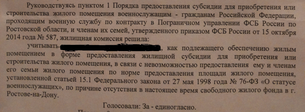 У меня уже третий суд по этой же теме. Только меня после рождения ребенка с ЖП (Москва) перевели на ЖС, (без моего согласия). Так в суде секретарь ЖК в качестве доков представила рапорт, что я с ее слов, отказался от ЖП, отказался прибыть для подписания ДСН на кв., кот. не соответствовала метражу, и отказался прибыть для того, чтобы написать отказ от предложенного ЖП. Во как! А судья написала, что у нее нет оснований не доверять секретарю. А при личной беседе с Усовым В.Н., кот. также как и у Вас подписал письмо от ЖК, где все было простым враньем сказал, что они не несут никакой ответственности за действия ЖК, но при этом написал, что полностью поддерживает решение ЖК. И своего специалиста присылает на судебные заседания, что незаконные решения ЖК проводить в жизнь и поправлять судей, если они вдруг захотят судить по Закону.QR_BBPOST 10 мая написал рапорт начальнику управления о нарушении кодекса сотрудника ФСБ юристом подполковником (с фатами вранья в суде, СК, ПРОКУРАТУРЕ и оскорблении), месяц прошел. и на рапорт от 7 марта отправили ответ только 21 апреля (печать на конверте). Буду с суд подавать о нарушении закона.