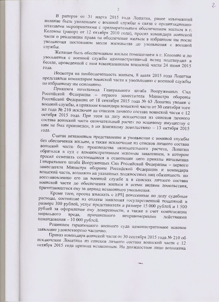 У меня сомнения, может про инфраструктуру, автобусы и воду не стоит писать. Стоит ли писать, что на служебное жилье даже договора служебного найма не заключал? Гарнизонный суд в решении про служебку вообще ничего не упоминал. Она только в возражениях командования и то косвенно, что я в ней живу. Может и не надо писать про ИМПЖ или по месту службы когда перевели из части в часть?