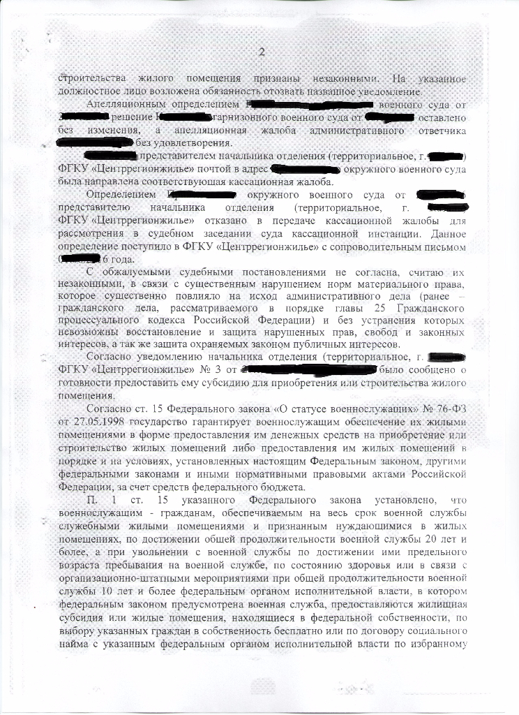 #5242[ref]kazan79[/ref], в возражении надо написать что на военнослужащего в соответствии с КАС РФ была возложена обязанность доказать нарушения его прав. В соответствии с решением суда военнослужащий доказал существенные обстоятельства по делу что право военнослужащего проходить военную службу до момента обеспечения жп оспариваемым уведомлением будет нарущено. А именно будет нарушено право военнослужащего предусмотренное абз2 п. 1 ст 23 о статусе - как я понимаю именно это право суд признал что уведомлением нарушается и что действиями ружо искусственно создаются обстоятельства предусмотренные абз3 п1 ст23 о статусе и направлены на увольнение военнослужащего без ЖП.