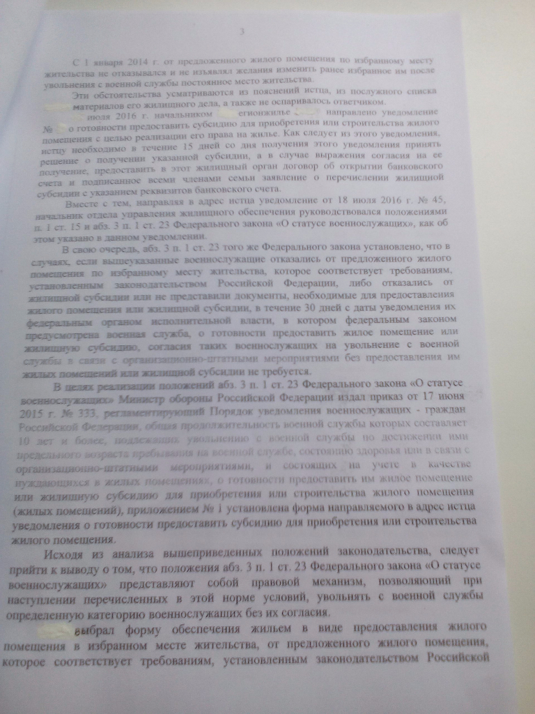 А В Вашем же понимании, что также делают суды подменяют понятия, т.е. вместо того чтобы установить из-за чего произошел перелом, суд начинает говорить сначала, а что воин-то идиот и поэтому его прав не нарушено, и про прелом в результате в решении ни слова, так и по теме ветки - судам и ответчикам указывается, что уведомлением нарушается право на обеспечение жилым помещением в период прохождение военной службы, предусмотренн. абз.2 п.1 ст.23 О статусе и создаются негативные последствия в виде обстоятельств, которые воин не совершал, предусмотренн. абз.2 п.1 ст.23 - О статусе, а ответчик и суд говорят, что действия по направлению уведомления имеют целью реализацию права на жилище, т.е. Ваши права на жилище ст.15 О статусе - не нарушены , т.е. игнорируют нарушение абз.2,3 п.1 ст.23 О статусе, т.е. игнорируют перелом ноги вообще.