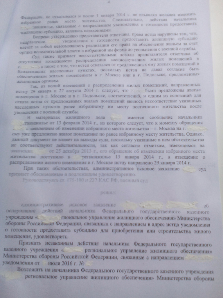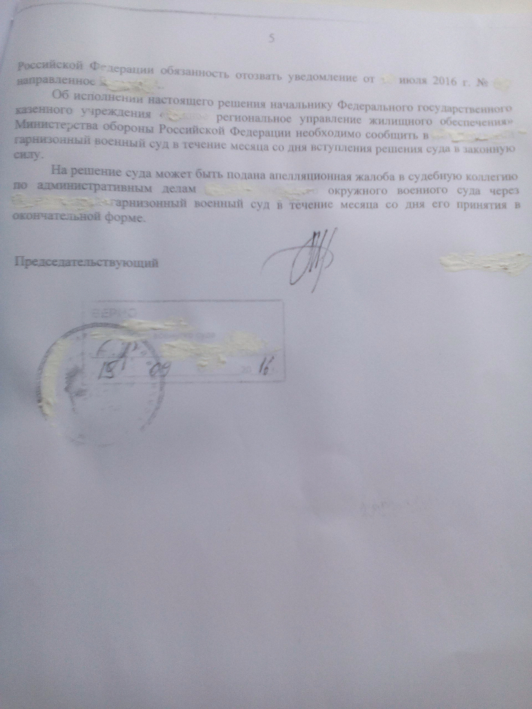 Определение судьи Архангельского гарнизонного военного суда от 4 июля 2016 года, которым оставлен без движения административный иск СТЕПАНОВА Александра Владимировича об оспаривании действий начальника отделения территориального (г. Архангельск) федерального государственного казенного учреждения "Северное региональное управление жилищного обеспечения" Министерства обороны Российской Федерации, связанных с направлением административному истцу уведомления о готовности предоставить ему субсидию для приобретения или строительства жилого помещения, оставить без изменения, а частную жалобу СТЕПАНОВА А.В. – без удовлетворения. Скорее всего такой же результат будет в Верховноо суде, судьи по считают, что уведомление прав ВС не нарушает. Посмотрим, осталось немного ждать.