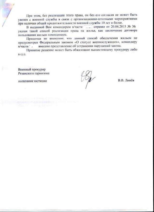 #964А я бы не стал делать выводы до получения официального ответа, если даже прокурята напишут, что нарушений Федерального законодательства в действиях должностных лиц не выявлено, это не значит, что после отказа в получении ЖС военнослужащий подлежит увольнению, а вот их ответ о том, что направленное в Ваш адрес уведомление о готовности предоставить ЖС, каких-либо правовых последствий не несет, будет хорошим защитным тотемом от командования части. И в случае, если командование части все же направит документы на увольнение, уже можно говорить, что командир части просто вытирает ноги об Федеральное законодательства РФ. У меня знакомый сослуживец обжаловал в прокуратуре, справку о планируемом увольнении из ВС РФ выданную командиром части. Теперь полагаю, что данный ответ можно приложить, и в ответ о неготовности получать ЖС.QR_BBPOST Предварительно уже сказали,что нарушений законодательства в ходе проведения проверки не выявлено))))и сказали,что разъяснили в ответе порядок получения субсидии.Одним словом перепечатали статью закона))))