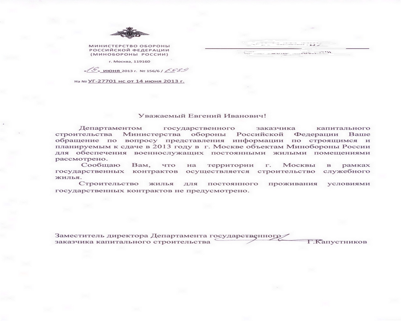 Прошу задать вопрос такого плана. Президент сказал всех кто до 2012 года был признан обеспечить в этом году. Зам МО что, не Указ - Указ Президента, если он с такой прытью служебит объекты, а по сути это делается чтобы не выполнить Указ Президента. У Зам МО первоочередная задача оквартирить всех кто до 2012. Как он планирует её выполнять, если сам ставит припятствия для реализации Указа Главы Государства? Как? КАК? и КАК? МО планирует выполнять поставленную задачу?