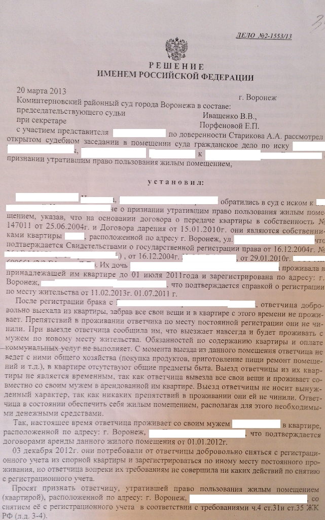 #12172Говорилось в решении что с такого то числа в квартире не проживает выехала по адресу...? Или что то подобное?QR_BBPOST По решению суда от 20.03.2013 выписана.