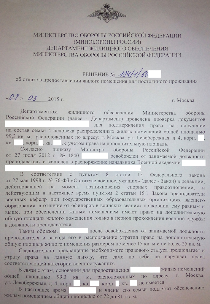 Дело в том что, затягивать с получением отказа в получении решения об отказе не в нашу пользу. Поскольку военнослужащий получил извещение на конкретную квартиру с которой он согласился и отказ на конкретную квартиру. Пока мы не получаем решение квартира уходит причем одновременно с выпиской решения. Как уже писал, мою квартиру перераспредили двоим одновременно при этом до меня само решение не довели. Первый суд который выиграл признал решение незаконным, но обязывал ЗРУЖО распределить жилое помещение с учетом права на допы, а не конкретную квартиру, поскольку я не выполнил никаких предварительных действий чтобы ДЖО закрепило квартиру за мной до окончания судебных тяжб. Правда как только узнал о том что мне выписан отказ (но его еще не получил) на эл. почту ЗРУЖО написал письмо что с решением не согласен и буду обжаловать, а все действия по квартире приостановили. Ответ досих пор гдето ходит, как и многие другие.