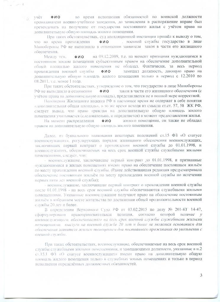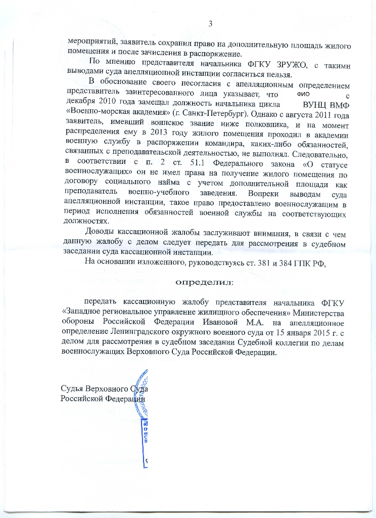 #5893Насколько я понял, ЛОВС удовлетворил по той причине, что право на допы не было реализовано по вине МО РФ, не предоставившего жилье с допами в период когда право на это имелось (возможно по причине не исполнение этой обязанности государства в разумные срок), и потому что человек был выведен в распоряжение по независящей от него объективной причине (он не виноват в неисполнении обязанности со стороны государства и в том, что его должность сократили - поэтому неправомерно лишать его права на допы). По крайней мере об этом в своей жалобе пишет само ЗРУЖО, в доводах, приведенных ЛОВС в мотивировке определения. Однако, далее в своей жалобе ружоповцы не приводят достаточных ИМХО аргументов, способных опровергнуть это мнение ЛОВС. По крайней мере для меня не выглядит убедительным их аргумент, что человек имел право на допы в течении менее года - нет такого ограничения в законе в части права на допы, что если менее года был преподавателем, то допы можно не давать. А потом вообще начинается игра рассуждениями на тему до и после 98 года, служебное силье и т.п. - делается странный вывод, что если категории до 98 и после 98 находятся в разном положении и категория после 98 года находится в худшем положении, то надо сделать плохо всем категориям и отнимать право на допы и у категории до 98 года???. Короче если кому то плохо, то значит плохо должно быть всем - странная на мой взгляд логика.Качать, качайте, но и мнения свои прошу выкладывать. Мое мнение что данная кассация сущий бред. Но не это главное, а главное что ее проглотил ВС. Подождем чем же мотивировал ВС чтобы ее удовлетворить.