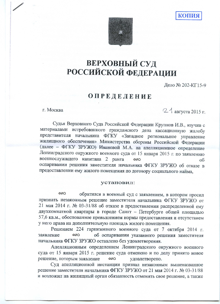 #5904Кассационное определение судебной коллегии по делам военнослужащих № 202-КГ15-9 от 15.09.15 г.